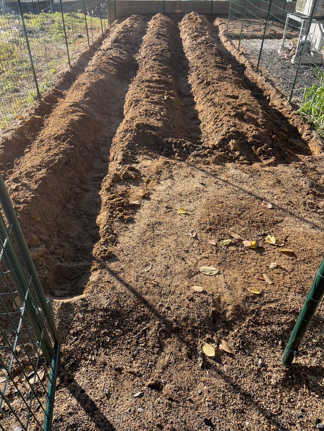 残りの堆肥を撒いて、ようやく畝が完成しました。