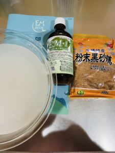 今回は、このEM-1なる原液を米のとぎ汁で発酵液を作りました。