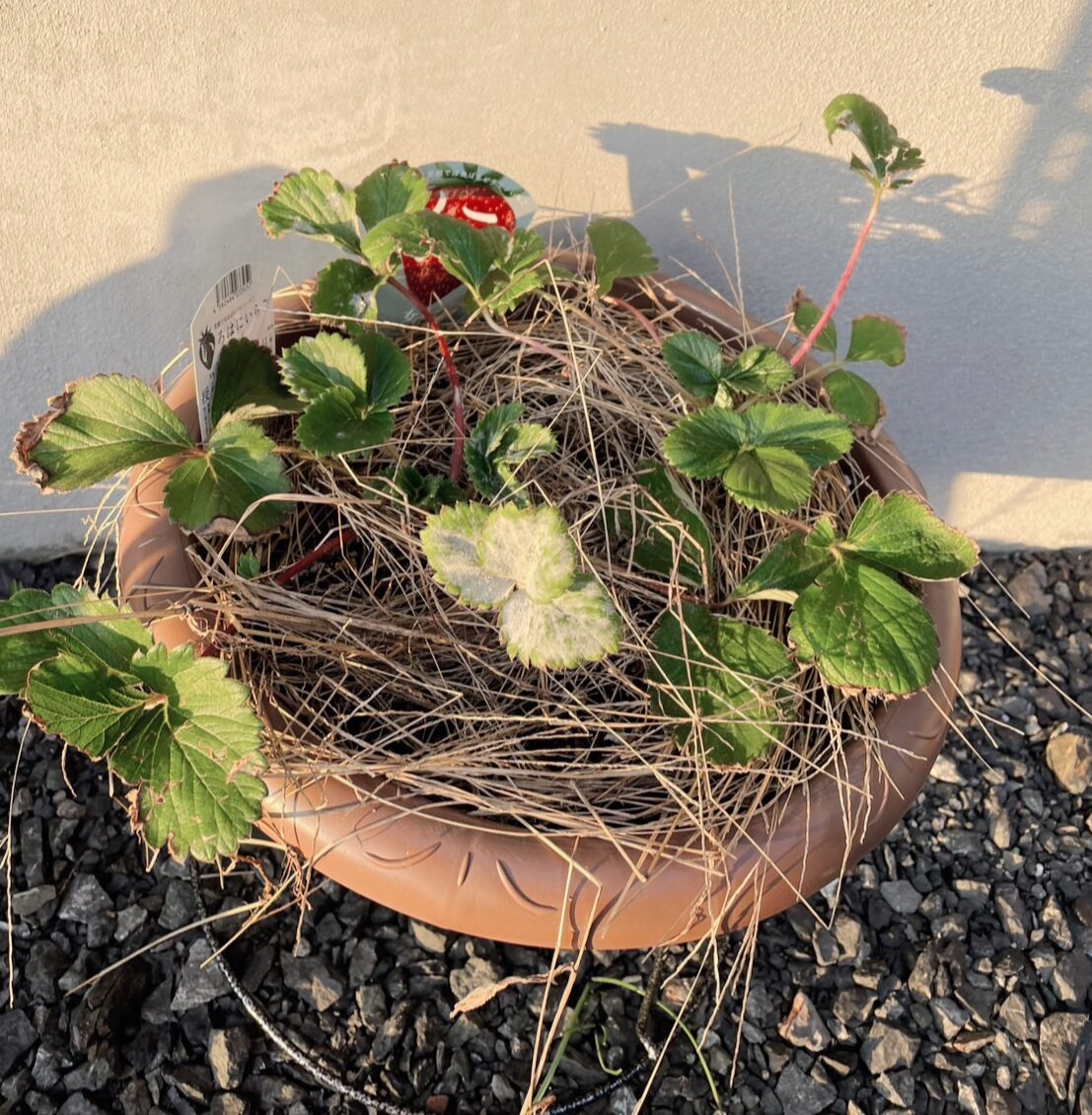 なかなか工事が進まず、軒下で待機中のいちごの苗です。
